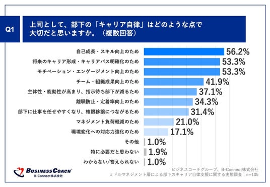 「Q1.上司として、部下の「キャリア自律」はどのような点で大切だと思いますか。(複数回答)」(n=105)と質問したところ、