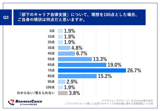 「70点」が26.7%、「60点」が19.0%という回答となりました。多くのマネジャーは部下のキャリア支援に取り組んでいるものの、何かしらの課題感を抱いていることが明らかになりました。
