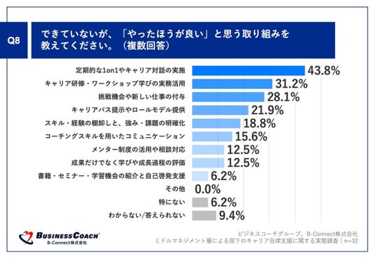「定期的な1on1やキャリア対話の実施」が43.8%、「キャリア研修・ワークショップ学びの実務活用」が31.2%、「挑戦機会や新しい仕事の付与」が28.1%という回答となりました。