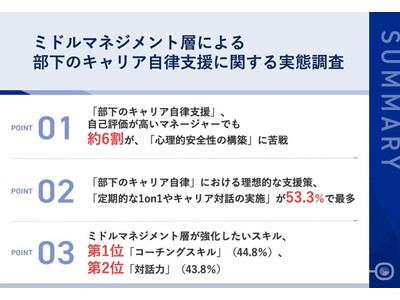 ビジネスコーチグループ、B-Connect株式会社(東京都港区、代表取締役社長:杉本 博史)は、従業員1,000名以上の企業に勤めるミドルマネジメント層(部長・課長)105名を対象に、ミドルマネジメント層による部下のキャリア自律支援に関する実態調査を実施しましたので、お知らせいたします。