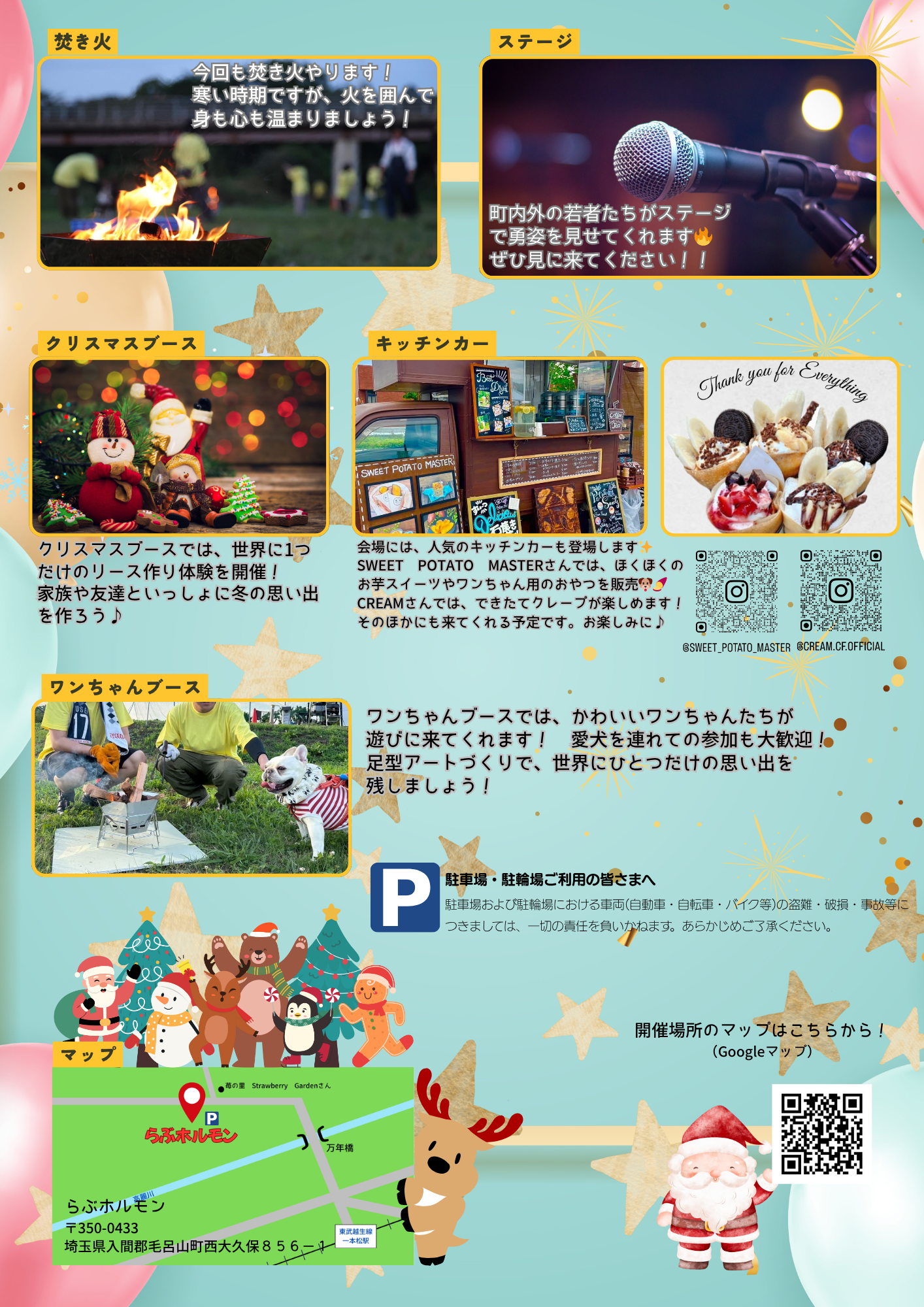 今回のイベントは、2024年度に「第3回毛呂山町ビジネスコンテスト」で採択された事業です。その後、毛呂山町と本学は連携協定を締結。中谷ゼミナールの学生を中心に、毛呂山の魅力を若者にも広める事業を企画・運営しています。6月のプレイベントに続き、焚き火でマシュマロを焼いたり、キッチンカーの料理やスイーツを食べたり、クリスマスリースを作ったりと、楽しいコンテンツが盛りだくさん!