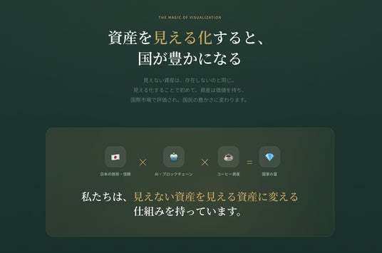 カスタマークラウド株式会社(代表取締役:木下寛士)は、発展途上国をはじめとする諸国を対象に、コーヒー豆など国家が保有する資産を「国家デジタルアセット」として可視化し、その価値を適切に評価する国家資産価値化・加速構想「v/acc(ブイアック, National Asset Valuation Acceleration)」の提供を始めた。
