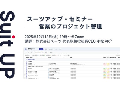 株式会社スーツ(所在地:東京都千代田区、代表取締役社長CEO:小松 裕介)は、2025年12月12日(金)19時から、当社代表の小松が講師を務めるスーツアップ・セミナー「営業のプロジェクト管理」を無料開催します。