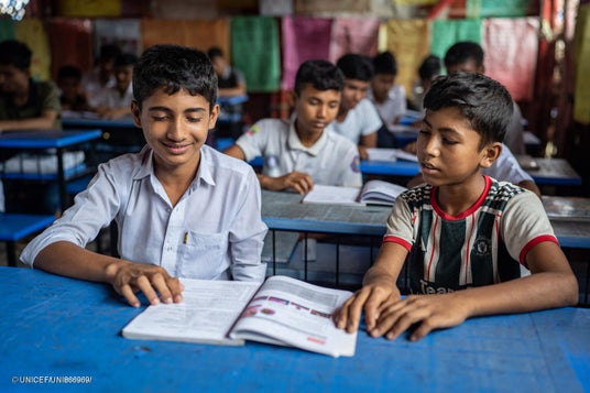コックスバザールのロヒンギャ難民キャンプにある学習センター。教育支援は、児童婚や武装集団による徴用の危険から子どもたちを守る手段の一つ(バングラデシュ、2025年8月20日撮影) (C) UNICEF/UNI866969/