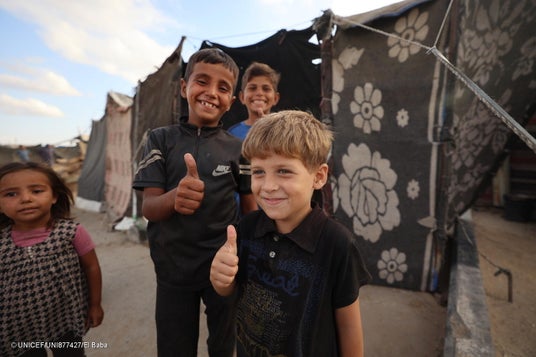 停戦の発表を喜ぶガザの子どもたち(パレスチナ、2025年10月9日撮影) (C) UNICEF/UNI877427/El Baba