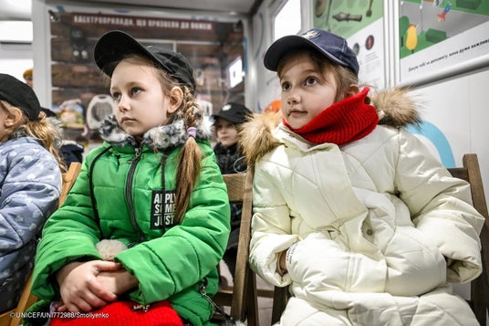 ザポリージャにあるユニセフが支援する移動式教室で、戦争下において安全を確保する方法を学ぶ小学1年生の子どもたち(ウクライナ、2025年2月25日撮影) (C) UNICEF/UNI772988/Smoliyenko