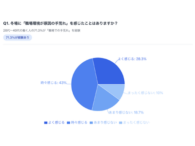 冬場に職場環境が原因で手荒れを感じたことがあるかを調査したところ、「よく感じる」(28.3%)と「時々感じる」(43.0%)を合わせて71.3%が職場での手荒れを経験していることが分かりました。