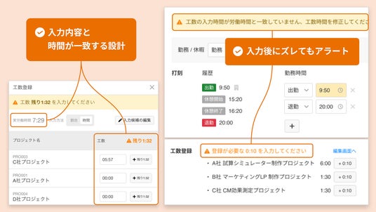入力時・修正時・提出時の各段階で勤怠との不整合を自動検知・通知し、管理者の手動確認を不要にします。