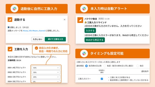 Slack連携機能により、入力漏れや誤入力があった際には自動でリマインド通知が送信されます。なお、メールで通知を受け取ることも可能です。