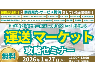 日本最大級の物流コンサルティングファーム 船井総研ロジ株式会社(本社:東京都中央区、代表:橋本直行、以下「船井総研ロジ」)は、2026年1月27日(火)11:00~12:00、「運送マーケット攻略セミナー」をオンラインで開催いたします。