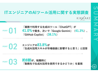 株式会社キッカケクリエイション(本社:東京都渋谷区、代表取締役:川島 我生斗)は、生成AIを活用しているITエンジニア431名を対象に、ITエンジニアのAIツール活用に関する実態調査を実施しましたので、お知らせいたします。