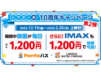 KDDIは、約1,500万人が利用しているおトクなサブスクリプションサービス「Pontaパス」(月額548円)の映画鑑賞クーポン「シアター割」の提供10周年を記念し、IMAX(R)も含め映画が期間中いつでも1,200円(大人料金の場合)で鑑賞できる「ローソン・ユナイテッドシネマ グループ シアター割10周年キャンペーン」(以下 本キャンペーン)の第2弾を、2025年12月19日から2026年2月26日まで開催します。