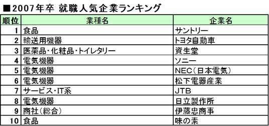 20年前、2007年卒の「就職人気企業ランキング」トップはサントリーで、前後も含めると2006~08年に3年続けて1位でした。次いで2位のトヨタ自動車は2003~07年卒に5年連続、3位の資生堂は2006~12年に7年連続、7位JTBは2002~07年に6年連続でトップ10入りする人気ぶり。資生堂は2009~10年は1位でした。業種で目立つのは「電気機器」。ソニーに加え、NEC(日本電気)、松下電器産業、日立製作所の4社がトップ10に並びました。10社のうち8社をメーカーが占め、当時の日本の産業構造の特徴を反映した結果でした。9位の伊藤忠商事は、この年を皮切りに2027年卒まで21年連続でトップ10入りを続けています。
