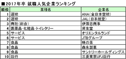 10年前の2017年卒はANA(全日本空輸)とJAL(日本航空)の航空2社がトップ2を占め、翌年も同じ順位。ANAは2016~19年の4年連続1位でした。コロナ禍の直撃を受け2021年卒から新卒採用を中止した両社ですが、採用再開後、インバウンド(外国人旅行客)の活況もあって人気も復活し、2027年卒ではANAが14位、JALも26位に上がってきました。