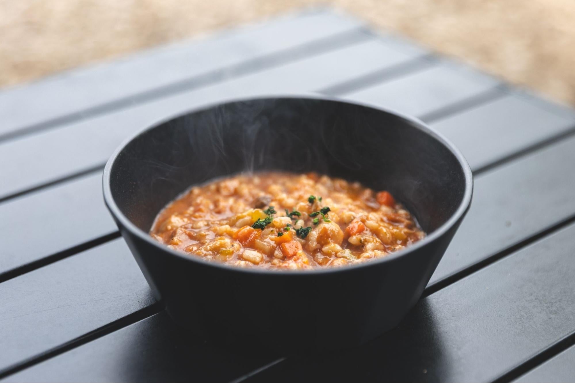「もち麦のトマトリゾット」。「サウナの後に外で食べる」シリーズは、11月30日に開業した『Earthboat Nasu』をはじめとするEarthboatの各拠点の物販※でレトルトパッケージで提供され、Earthboatの客室に備え付けのキッチンで簡単に調理しお召し上がりいただけます。