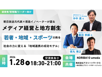 株式会社Athlete Works(以下「アスリートワークス」)は、一般社団法人アスリートサポートジャパンと共催で、2026年1月28日(水)18時30分よりNORIBA10 umedaにて、朝日放送グループホールディングス株式会社 前代表取締役社長で「バーチャル高校野球」元担当者の沖中 進氏、株式会社メディアドゥ 代表取締役社長 CEOで一般社団法人徳島イノベーションベース代表理事の藤田 恭嗣氏をお迎えし、「メディア経営と地方創生 ~若者・地域・スポーツの熱を社会の力に変える『地域連携の成功モデル』~」をテーマにトークイベントを開催します。