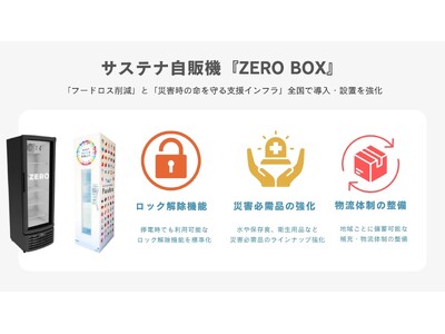 ZERO株式会社(本社:東京都台東区、代表取締役:沖杉 大地、四辻 弘樹、以下「ZERO」)は、フードロス削減・CO2削減に貢献するサステナ自販機『ZERO BOX(ゼロボックス)』の「災害初動インフラ」としての活用を強化し、自治体との連携拡大および防災用途での設置加速を新たにお知らせいたします。