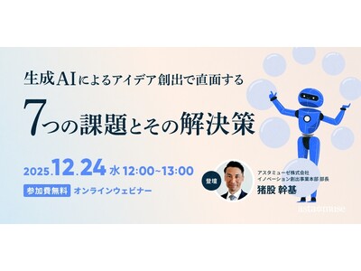 アスタミューゼ株式会社(本社:東京都千代田区、代表取締役社長 永井歩)は、2025年12月24日(水)12:00-13:00に、無料ウェビナー「生成AIによるアイデア創出で直面する7つの課題とその解決策」を開催いたします。
