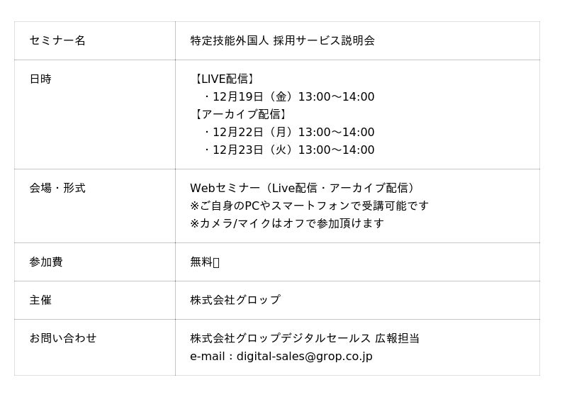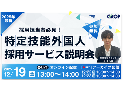 株式会社グロップ(本社:岡山県岡山市中区、代表取締役社長:原田 竜一郎)は、深刻化する現場の人材不足に対し、特定技能外国人の「採用」と「定着」の課題を一社完結で解決する新サービスモデルを解説する無料ウェビナーを開催します。
