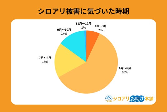 調査によれば、シロアリ被害に気づいた時期のうちもっとも多いのは冬の寒さが和らぎ、気温が上がる4~6月でした。この時期はシロアリが活発化し、羽アリが発生する時期でもあります。