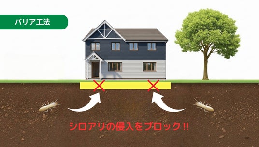 シロアリの侵入を防ぐ目的でもっともよくおこなわれるのは、「バリア工法」と呼ばれる施工です。住宅の床下に専用薬剤を満遍なく散布することで、土中に侵入しているシロアリを駆除すると同時に、新しいシロアリが侵入できない層(バリア層)をつくります。