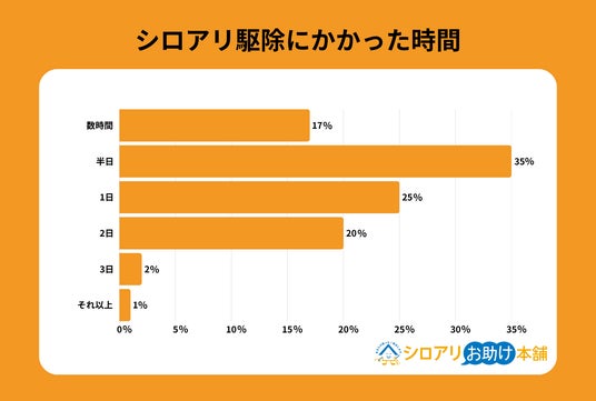 調査結果によると、シロアリ駆除・予防にかかる時間は「半日」が35%ともっとも多く、「1日」が25%、「2日」が20%となりました。