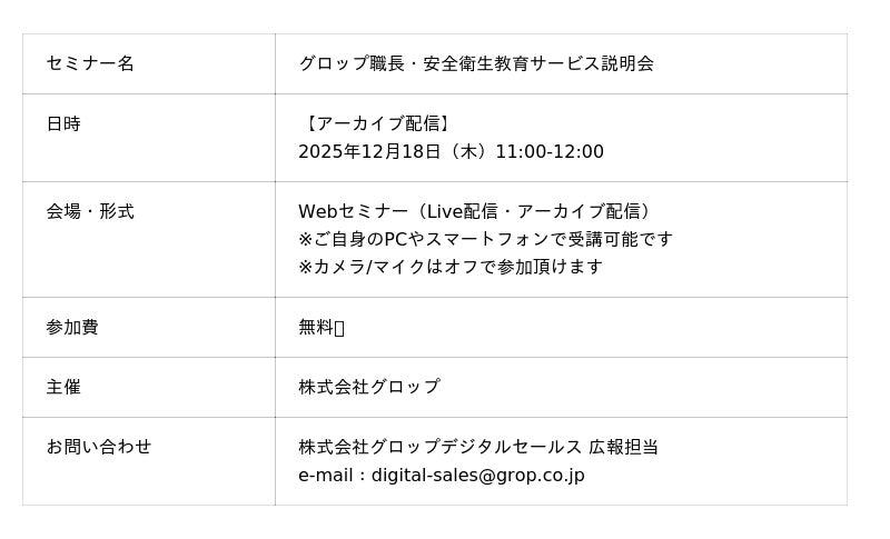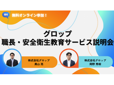 株式会社グロップ(本社:岡山県岡山市中区、代表取締役社長:原田 竜一郎)は、法定講習を現場で活かすための具体的な手法と、自社に合わせた安全衛生教育プログラムの導入事例を紹介する無料ウェビナー「グロップ職長・安全衛生教育サービス説明会」を2025年12月18日(木)に開催します。