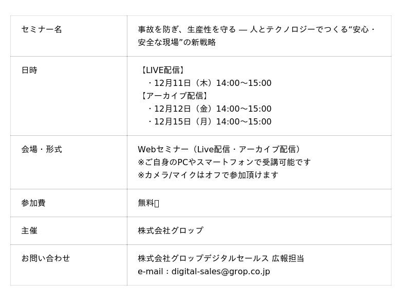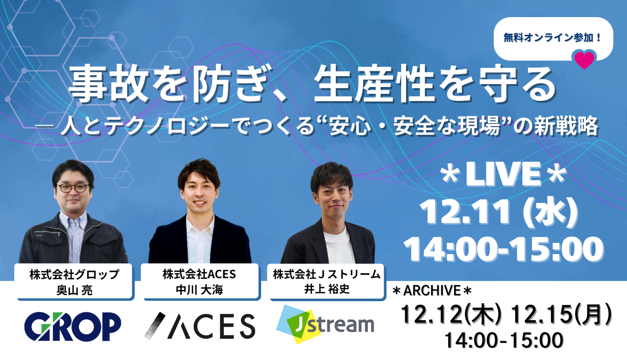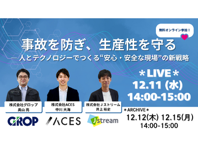 事故を防ぎ、生産性を守る ― 人とテクノロジーでつくる“安心・安全な現場”の新戦略」を、2025年12月11日(木)にライブ配信、その後アーカイブ配信にて開催いたします。