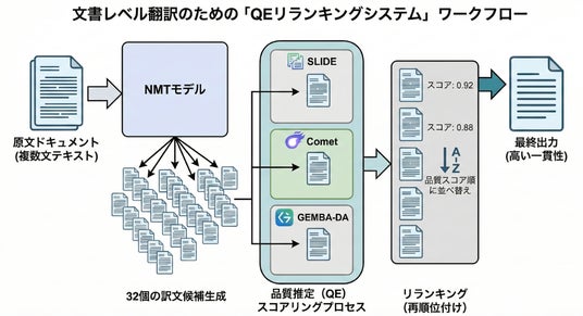 翻訳AIが作り出す複数の訳文候補の中から、品質推定(Quality Estimation:QE)を使って“より良い訳”を選び直す「QEリランキング」という手法を、文書全体を対象に検証しました。