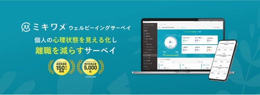 ミキワメ ウェルビーイングサーベイは、社員の心の幸福度を向上させ、休職や離職を防ぐサービスです。スマホやPCから3分で完了するコンディションアンケートに、社員が定期的に回答することで、組織と個人のメンタルのコンディションを可視化することができます。社員の性格と心理状態を元に、サポートが必要な社員を可視化し、ケアの方法をAIが提示し離職・休職を防ぎます。また、受検者本人にもアドバイスを提供し社員の自律自走を支援します。