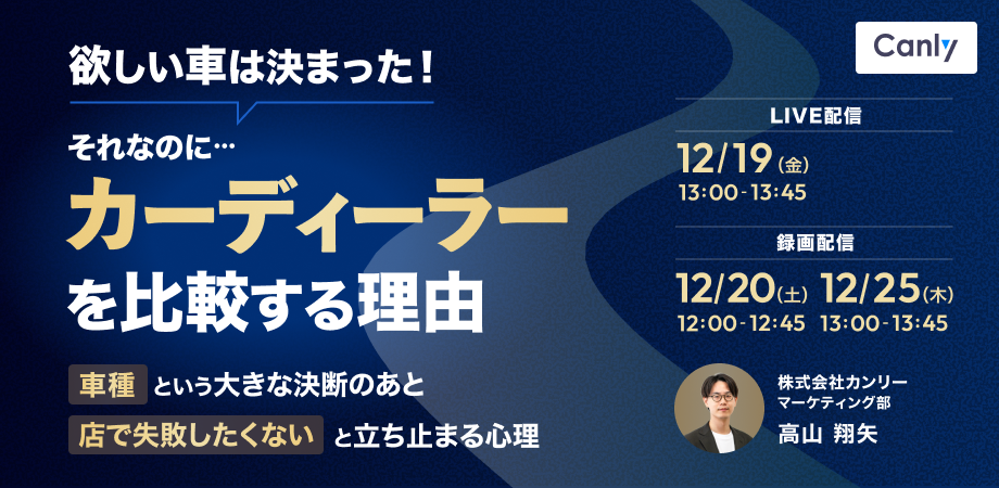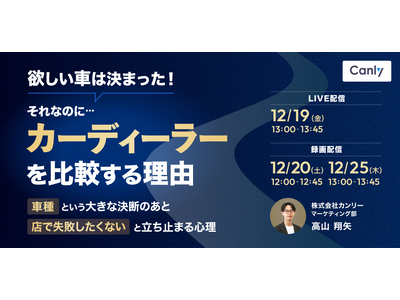 Google ビジネスプロフィール、Yahoo!プレイス、Appleマップなどの3大地図媒体、HP、アプリ、SNSなどの店舗集客媒体の一元管理サービス「カンリー店舗集客」の開発・提供を行う株式会社カンリー(所在地:東京都品川区、代表取締役:辰巳 衛,秋山 祐太朗)は2025年12月19日(金)・20日(土)・25日(木)の3日程で自動車販売店向け無料セミナー【欲しい車は決まった!それなのに、カーディーラーを比較する理由~「車種」という大きな決断のあと「店で失敗したくない」と立ち止まる心理~】をオンライン開催いたします。