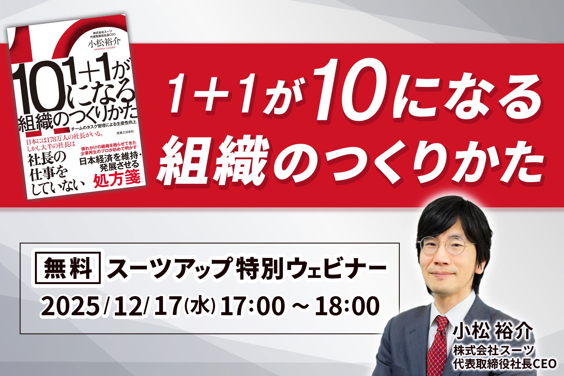 株式会社スーツ(所在地:東京都千代田区、代表取締役社長CEO:小松 裕介)は、2025年12月17日(水)17時から、当社代表取締役社長CEO 小松 裕介による、2025年最後の開催となる第21回スーツアップ特別ウェビナー「1+1が10になる組織のつくりかた」を無料開催します。