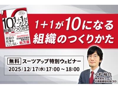 当社では12月17日(水)17時から、講師に、当社代表取締役社長CEO 小松 裕介による、2025年最後の開催となる第21回スーツアップ特別ウェビナー「1+1が10になる組織のつくりかた」を無料開催します。