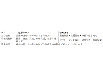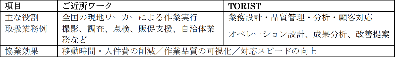 今回の協業では、ご近所ワークの「分散された現地実行力」と、TORISTの「業務設計・品質統制・データ活用力」を組み合わせ、