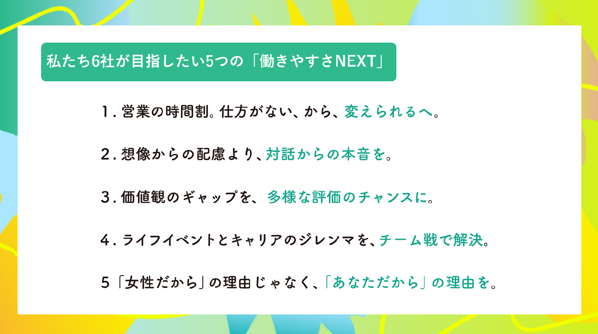 時間的制約が大きい「営業職」の働きやすさを変えることができれば、全社的な改善につながると考えたのが出発点です。営業部門の従業員の生の声とリアリティにこだわることで、社会にとって普遍性のある提言を導き出したいと考えました。業界を越えた熱い議論を経て、ギャップや分断を埋め、全員が活躍できることがゴールだと感じ、「男性」「女性」とわざわざ言わなくてもよい社会への第一歩として、今回の成果を6社共同の社会的メッセージとして発信したいと考えています。