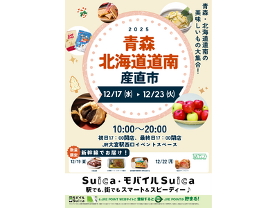 東日本旅客鉄道 (株) 盛岡支社 と(株) JR 東日本青森商業開発 (代表取締役社長 真壁まり子) は 、3月31日まで開催する「青森県・函館観光キャンペーン」に合わせ、青森県、北海道渡島総合振興局と連携して、地域活性化・観光流動の創出を目的とした「青森・北海道道南産直市」を大宮駅で開催します 。