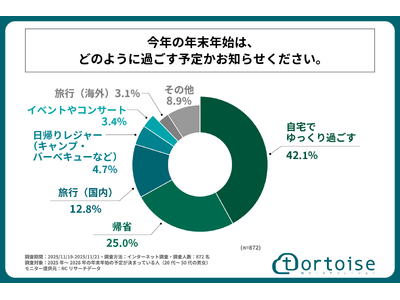 株式会社トータス(本社:神奈川県大和市、代表取締役社長:村野 公紀)が運営する「tortoise」は、今年の年末年始の予定が決まっている人(20代~50代の男女)を対象に「年末年始の過ごし方と交通手段に関する調査」を実施しました。この調査から、2025年~2026年の年末年始の予定が決まっている人の過ごし方やその際に利用予定の交通手段などが明らかになりました。