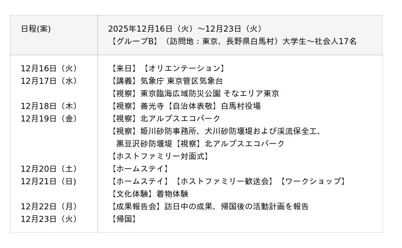 外務省が推進する国際交流事業「対日理解促進交流プログラム (JENESYS)」の一環として、SAARC加盟7か国の青少年35名が東京都と長野県(飯山市・白馬村)を訪問します。