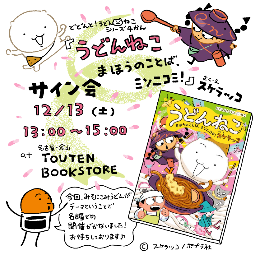 味噌煮込みうどんにちなんで、初の名古屋での開催となります。スケラッコさんが直接その場でイラスト入りのサインをしてくださる大変貴重な機会です。ぜひお越しください!