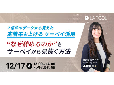 人的資本/ウェルビーイング経営支援を行う株式会社ラフール(本社:東京都中央区、代表取締役社長:結木啓太、以下「ラフール」)は、12月17日(水)に、2億件のデータから見えた「定着率を上げるサーベイ活用」 “なぜ辞めるのか”をサーベイから見抜く方法 をテーマとしたセミナーを開催します。