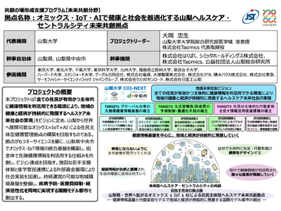 山梨大学発ベンチャーの株式会社Taomics(代表取締役:大岡 忠生)は、国立大学法人山梨大学を代表機関、株式会社Taomicsを幹事機関とする産官学連携プロジェクト「オミックス・IoT・AIで健康と社会を最適化する 山梨ヘルスケア・セントラルシティ未来共創拠点」が、国立研究開発法人科学技術振興機構(JST)の「共創の場形成支援プログラム(COI-NEXT)未来共創分野 (フェーズ1)」に採択されたことをお知らせします。