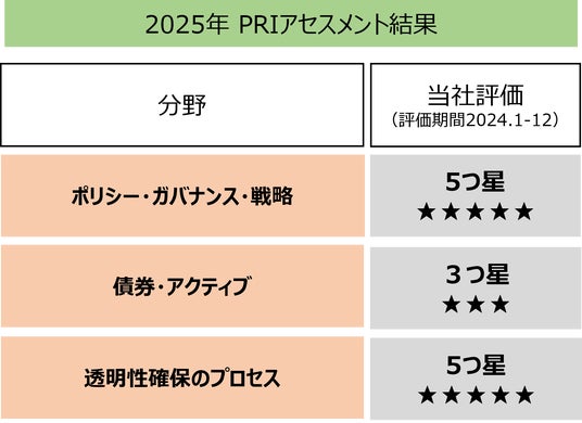 当社は、2024年の活動を対象とした2025年のPRI年次アセスメントにおいて、「ポリシー・ガバナンス・戦略」「透明性確保のプロセス」の2分野において最高評価の「5つ星」を獲得しました。今回の評価結果を踏まえ、グローバル水準を意識した責任投資取組のレベルアップに継続的に取り組んでいきます。