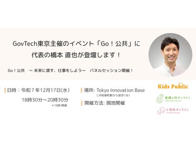「誰もが成育過程を健やかに過ごせる社会の実現」をビジョンに掲げ、産婦人科・小児科に特化した遠隔健康医療相談サービスを展開する株式会社Kids Public(本社:東京都千代田区 代表: 橋本 直也 以下、当社)の代表の橋本 直也は、一般社団法人GovTech東京(理事長:宮坂 学)が主催する「Go!公共」にパネリストとして登壇いたします。