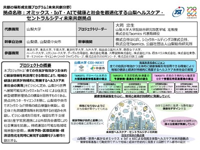 このたび、山梨大学を代表機関(プロジェクトリーダー:大学院総合研究部 大岡忠生准教授)、 山梨県中央市(市長:望月 智)を幹事自治体として、国立研究開発法人科学技術振興機構(JST)が公募した「共創の場形成支援プログラム(COI-NEXT) 未来共創分野(フェーズ1)」に採択されました。