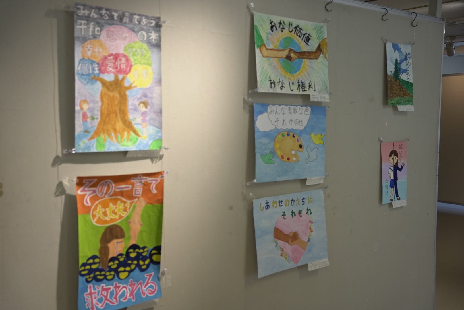 ▲小中学生が描いた人権ポスターの展示