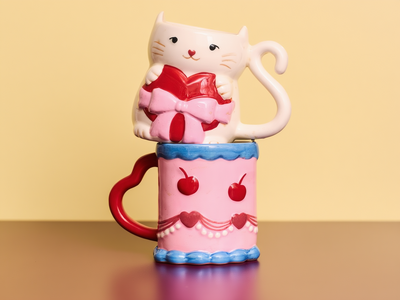 持ち手がハートのケーキ風マグ&ハートとリボンでおめかししたネコちゃんマグでティータイム