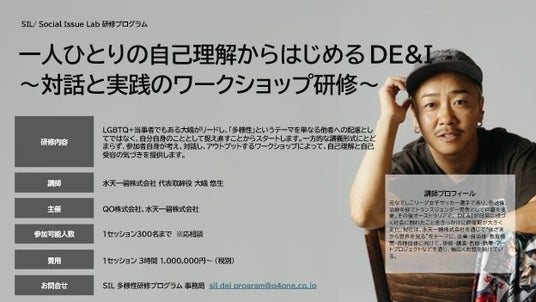 12月10日の世界人権デーを迎えるにあたり、企業におけるDE&Iが浸透し根付いていくことを目指し、新たなアプローチを開始します。企業のDE&I推進においては、「概念としては理解していても、自分事として捉えにくい」「社内の共通言語となる客観的な指標が不足している」という課題が依然として存在しています。そこで、座学だけでは浸透しにくい多様性の概念を、頭だけでなく心と体で理解するために、水天一碧株式会社との協業を開始しました。同社の代表であり、LGBTQ+当事者でもある大嶋氏の知見を取り入れ、一方的な講義形式ではなく、対話と気づきを重視した「体験型ワークショッププログラム」を共同で提供します。