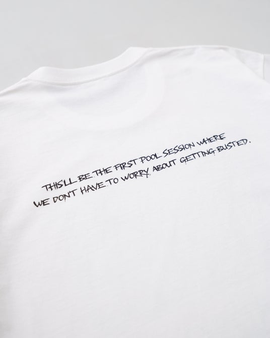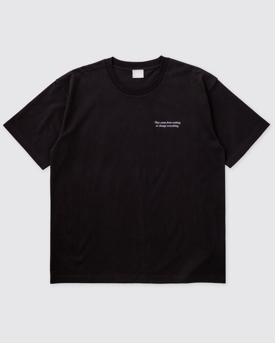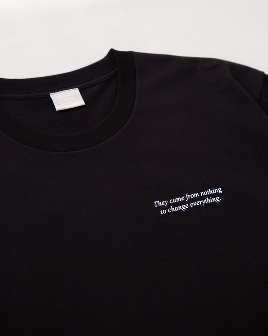 ボディ・生地はロゴTと同じものを採用し、フロントには、当時の映画公開時のコピー “They came from nothing to change everything.” のタイポグラフィをシルクスクリーンプリントで表現。バックには、夜のダウンヒルシーンの幻想的な街並みがボディに溶け込むよう、Tシャツの生地色を活かしたブラックマジックのインクジェットプリントを施しました。