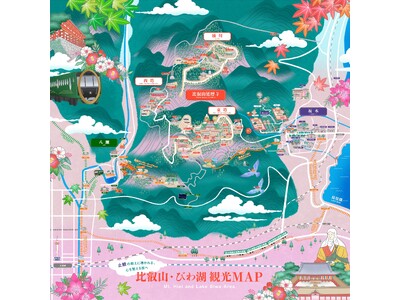 本マップは、比叡山とその周辺観光地の回遊性を高め“エリア”としての魅力を伝えることを目的としたイラストデジタルマップで、山全体に100のお堂が広がる世界文化遺産・比叡延暦寺を中心に、比叡山・びわ湖エリア全体を神秘的で荘厳なタッチのイラストで表現しています。