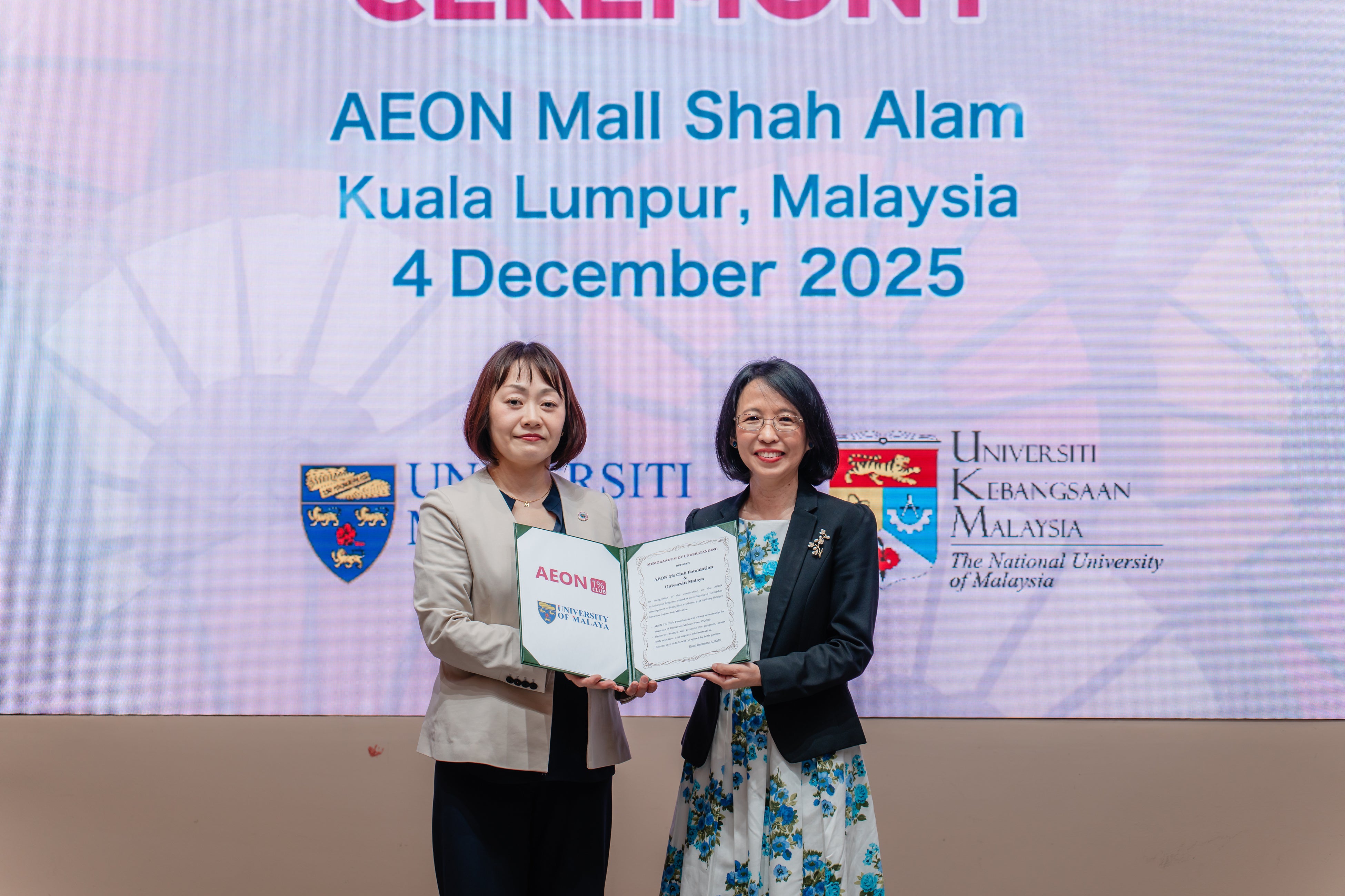 将来日本と母国の架け橋となり活躍してほしいとの願いのもと、奨学金制度「イオン スカラシップ」を2006年より開始し、アジア各国からの留学生及び、アジア各国の大学で学ぶ学生、約1万人に奨学金を給付してまいりました。これまでにインドネシア、カンボジア、タイ、中国、ベトナム、ミャンマーの6カ国にて奨学金を給付してまいりましたが、本年度よりマレーシアを代表する「マラヤ大学」、「マレーシア国民大学」の2大学を対象に開始することとなりました。